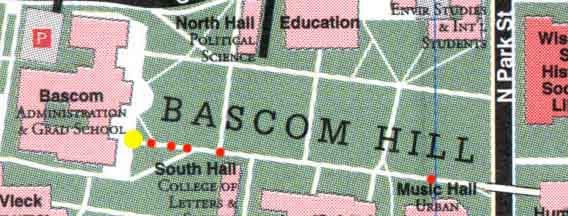 The entire tour is shown on the map below. North is up. The Sun is marked with a yellow dot, while all planets are marked with red dots. Note - These dots merely mark location. They are NOT representative of size for the stroll. Bascom Hall is on the extreme left, while the State Capitol is on the extreme right. The distance from Bascom Hall to the State Capitol Building is approximately 1.5 km.