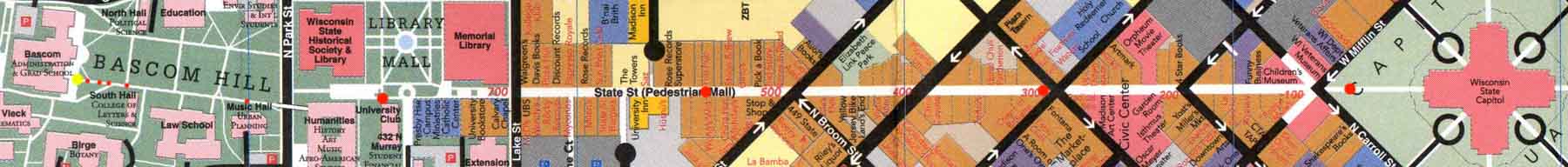 Our solar system is huge by our human standards and miniscule in terms of our galaxy and beyond. This site is a virtual planet stroll designed for the downtown section of the City of Madison in south central Wisconsin. Madison is the capital city of Wisconsin and also home to the main campus of The University of Wisconsin system. The administration building of the university (Bascom Hall) sits atop Bascom Hill where one has a fairly uninterrupted view of downtown Madison to the east all the way to the State Capitol Building. A nearly straight 1.5-km path connects these two prominent buildings, and mainly falls along State Street; one of our City's focal regions for dining, entertainment, and shopping. This pedestrian path is perfectly suited for the construction of a 4,000,000,000 to 1 scale model of our solar system with the Sun sitting on top of Bascom Hill and Pluto resting at the steps of the State Capitol. This site is available so that anyone can take the stroll using their computer and still obtain a fairly true feeling for the enormous distances that are covered between the planets compared to their relatively minute proportional sizes.